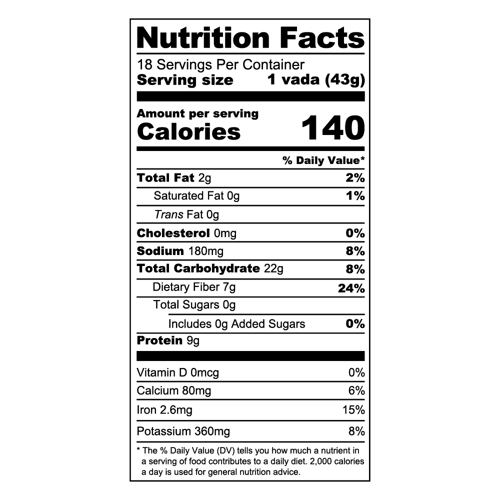 Black Matpe Beans (Black Urad Dal), Onions, Green Chili, Dried Curry Leaves Powder, Refined Sunflower Oil, Black Pepper, Salt.